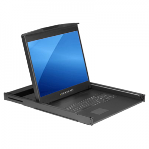 A 12-port DVI KVM switch integrated into a 1U high rack console drawer with an industrial LCD panel and 104-key keyboard with touchpad. The KVM console allows users to control multiple servers from one keyboard, video, and mouse setup. Option for a keyboard with trackball input device and DC power input.
